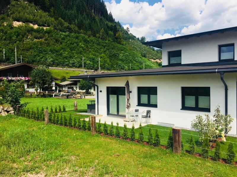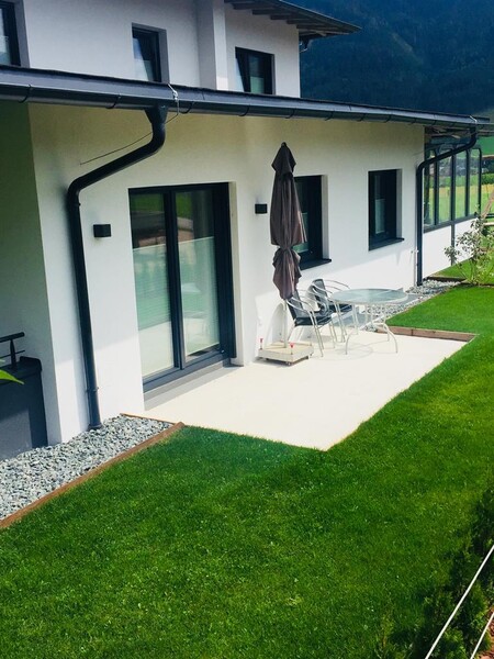 Eine 20 m2 Abendsonneterrasse mit Blick auf das Skigebiet und die Leoganger Steinberge.