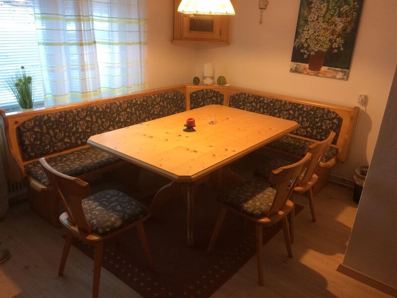 Im EG befindet sich eine der beiden voll ausgestatteten Küchen mit E-Herd, Kühlschrank mit Gefrierfach, Geschirrspüler, Mikrowelle, Kaffeemaschine, Wasserkocher, Geschirr, Besteck, usw. sowie eine gemütliche Stube mit TV, 1Schlafzimmer, Bad und WC.