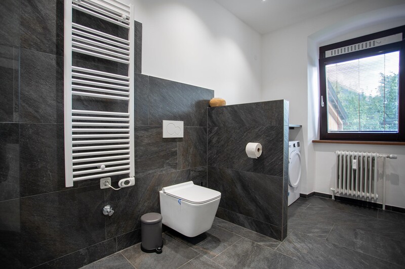 modernes Bad mit begehbarer Regendusche, Handtuchtrockner, WC
