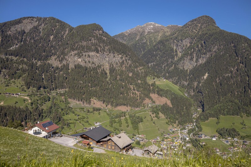 Auf dem Holzbankerl am kleinen Balkon trinkst du deinen Kaffee und genießt die sanften, wärmenden Strahlen der Sonne. Du blickst von 1250m Seehöhe hinunter auf die Ortschaft Mörtschach.