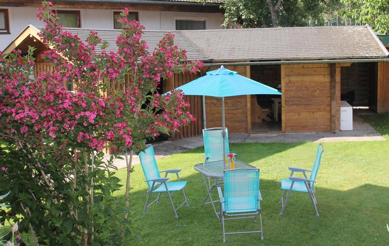 Im Sommer gibt es im Garten eine Liegewiese und ein Gartenhaus.