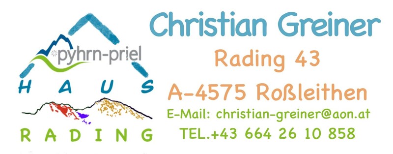 Anschrift: Rading 43 4575 Roßleithen Österreich Kontakt: Telefon: (0043) 664 2610858 Webseite: www.urlaubsregion-pyhrn-priel.at |