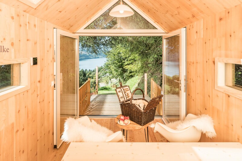 Durch die großzügigen Panoramafenster fällt der Blick abends auf die Sterne, morgens auf den Sonnenaufgang. Aus heimischem Lärchen-, Zirben und Fichtenholz gezimmert bietet das Biwak Platz für ein großes Bett, einen Tisch samt beschwingten Stühlen mit kuscheligem Lammfell sowie einen getrennt zugänglichen Waschraum mit WC und einer Waschschüssel aus Fluss-Stein. Mobilgeräte, Schlüssel und Terminkalender verstauen Sie in einem kleinen Fach, um die Zweisamkeit ganz ungestört zu erleben. Die Glasflügeltür öffnet sich zur Veranda hin, die zum Frühstücken Freien einlädt.