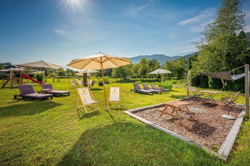 Spielplatz, kleiner Fußballplatz und großer Garten/Liegewiese direkt vor/hinter dem Hotel