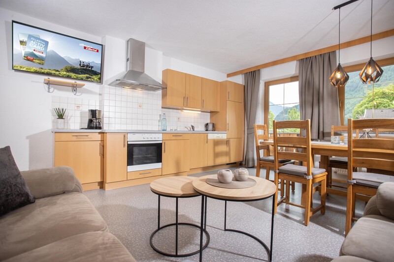 Lässiger Wohnkomfort: Hell und gemütlich eingerichtete Doppelzimmer, Dreibettzimmer und Vierbettzimmer mit Doppelbett und Einzelbetten versprechen relaxten Zillertal-Urlaub. Der moderne Wohn-Essbereich mit Couch und Flat-TV lädt zu geselligen Spiele- und Filmabenden ein, und die voll ausgestattete Wohnküche ist ideal zum gemeinsamen Kochen. Das moderne Badezimmer mit Dusche, Badewanne und separatem WC bietet jeden Komfort; eine 2.te Dusche und WC stehen auf Wunsch zusätzlich im Tiefparterre zur Verfügung.