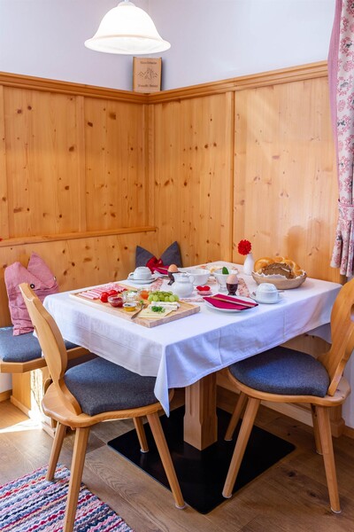 Unsere Zimmer sind ruhig gelegen und gemütlich im Tiroler Stil eingerichtet. Alle Zimmer verfügen über einen Südbalkon, Fernseher, kostenloses WLAN und Dusche mit WC. Starten Sie Ihren Urlaubstag mit unserem reichhaltigen Frühstücksbuffet mit Bio-Produkten der regionalen Bauern. Für Allergiker bieten wir glutenfreies Frühstück an. Auf Wunsch kann bei den Appartements das Frühstück dazu gebucht werden. Gerne bieten wir Ihnen auch unseren Brötchenservice an.