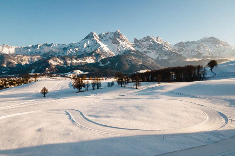 Loipeneinstieg ins weite Langlaufnetz Saalfelden Leogangs gleich vorm Hotel